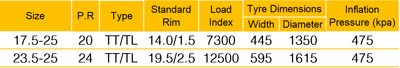 - Bias Tire Type : Nylon / Thread (Cold Tire).